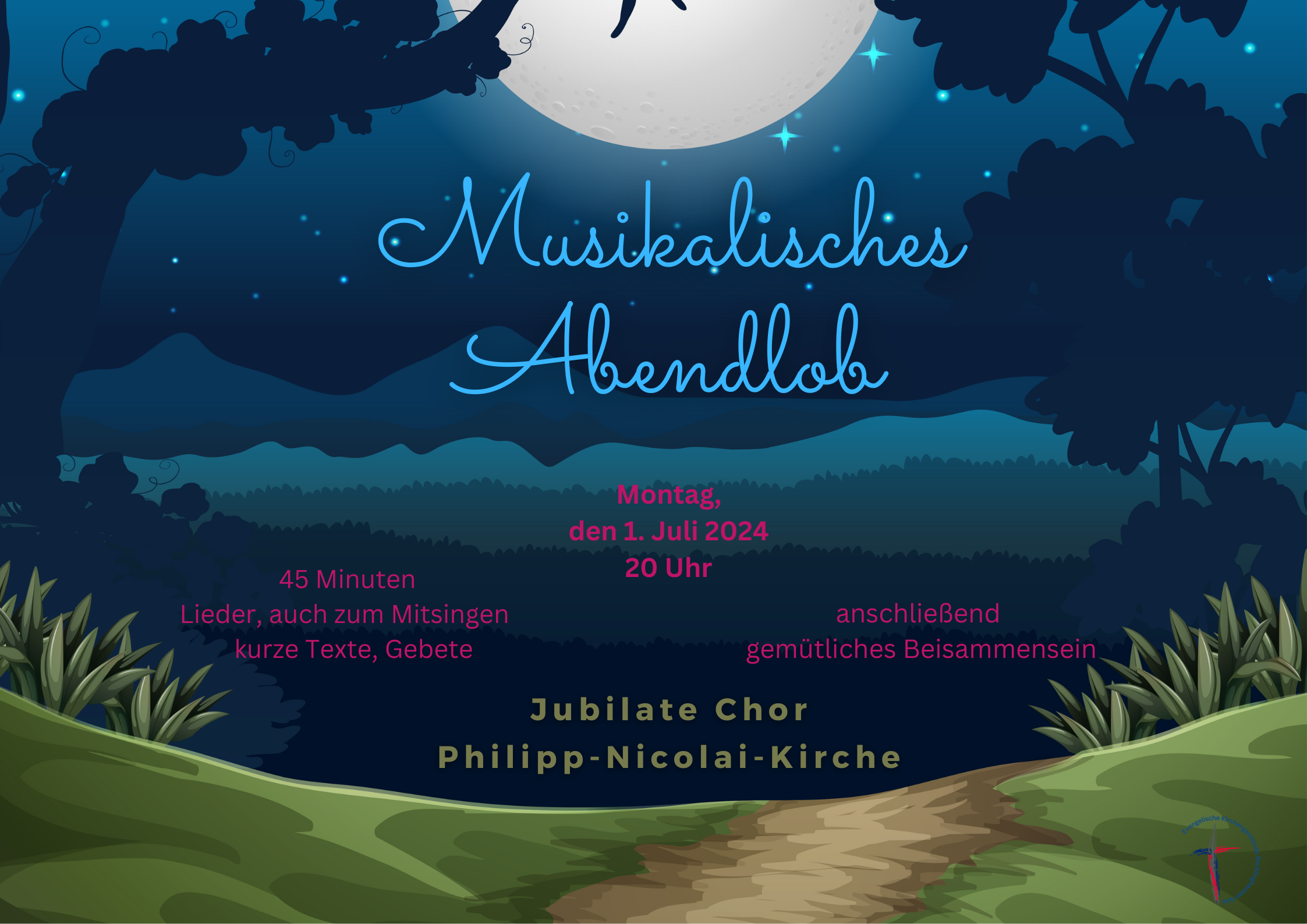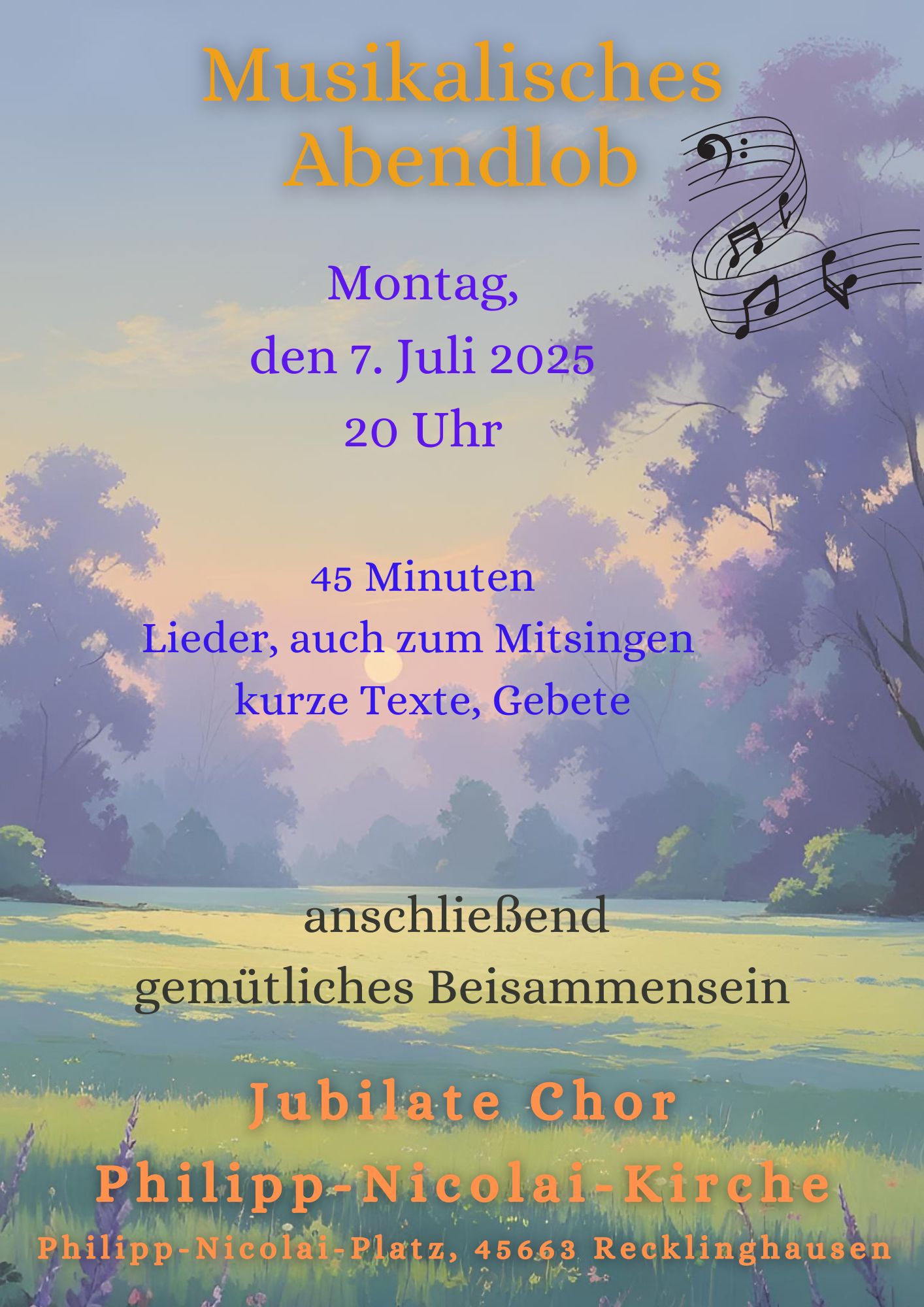 Die Evangelische Kirchengemeinde Recklinghausen-Süd lädt wieder zu einem Musikalischen Abendlob" ein. Am Montag, dem 7. Juli nehmen wir uns in der Philipp-Nicolai-Kirche um 20.00 Uhr Zeit für das Lob Gottes. Der Jubilatechor unter der Leitung von Heike Schollmeyer singt alte und neue geistliche Lieder, liturgisch begleitet von Pfarrer Heinz-Jürgen Roch. Im Anschluss sind alle zu einem Imbiss eingeladen.