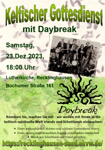 „Atempause“, so lautet da Motto des Keltischen Gottesdienstes am Samstag, den 23. Dezember um 18 Uhr in der Lutherkirche, Bochumer Str. 161. Einen Tag vor dem Heiligen Abend bietet dieser Gottesdienst die Möglichkeit, vor den Festtagen noch einmal zur Ruhe zu kommen und die Sinne zu schärfen. Mitgestaltet wird der Gottesdienst von den iro-schottischen Klängen der Band „Daybreak“. Im Anschluss besteht die Möglichkeit, bei Tee und Keksen noch etwas ins Gespräch zu kommen.