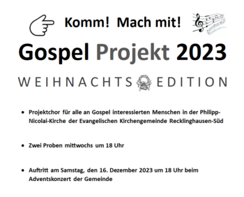 Projektchor für alle an Gospel interessierten Menschen in der Philipp-Nicolai-Kirche der Evangelischen Kirchengemeinde Recklinghausen-Süd · Zwei Proben mittwochs um 18 Uhr · Auftritt am Samstag, den 16. Dezember 2023 um 18 Uhr beim Adventskonzert