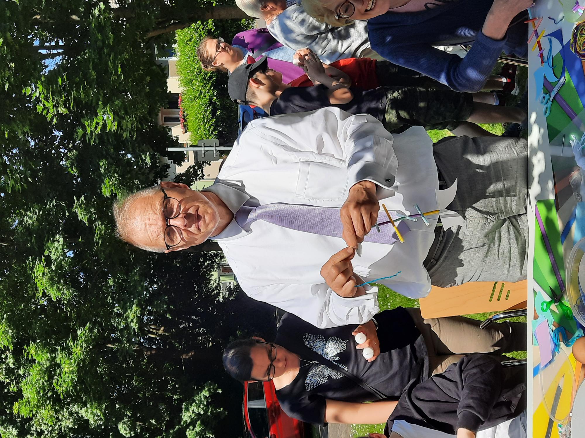 Die Kirche Kunterbunt wurde von zahlreichen Eltern mit ihren Kindern wieder einmal gut angenommen. Sie hörten bei strahlendem Sonnenschein unter freiem Himmel das Gleichnis vom verlorenen Sohn und die Geschichten von der Speisung der 5000, von Zachäus dem Zöllner und von der Taufe Jesu. Jede Geschichte wurde von einem Kreativangebot begleitet, das gerne angenommen wurde. Zusätzlich gab es die Möglichkeit, unter der Leitung von Henning Hey, in der Kirche Lieder zu singen. Dieses Angebot wurde von etlichen Gemeindegliedern angenommen. „Wer ist denn dieser Jesus?“ war das Thema der diesjährigen Kirche Kunterbunt und jeder und jede konnte am Ende etwas über Jesus sagen. Die Aktion wurde besondes von dem Team der Kinderkirche, von den Kindergärten „Philipp-Nicolai“ und „Wasserbank“ , und von zahlreichen Katechumenen und Konfirmanden begleitet. Ein kurzer und ansprechender Werkstattgottesdienst von Pfarrer Heinz-Jürgen Roch und ein leckeres Mittagessen, für das Karin am Wege und ihr Team verantwortlich waren, rundeten die Kirche Kunterbunt ab.