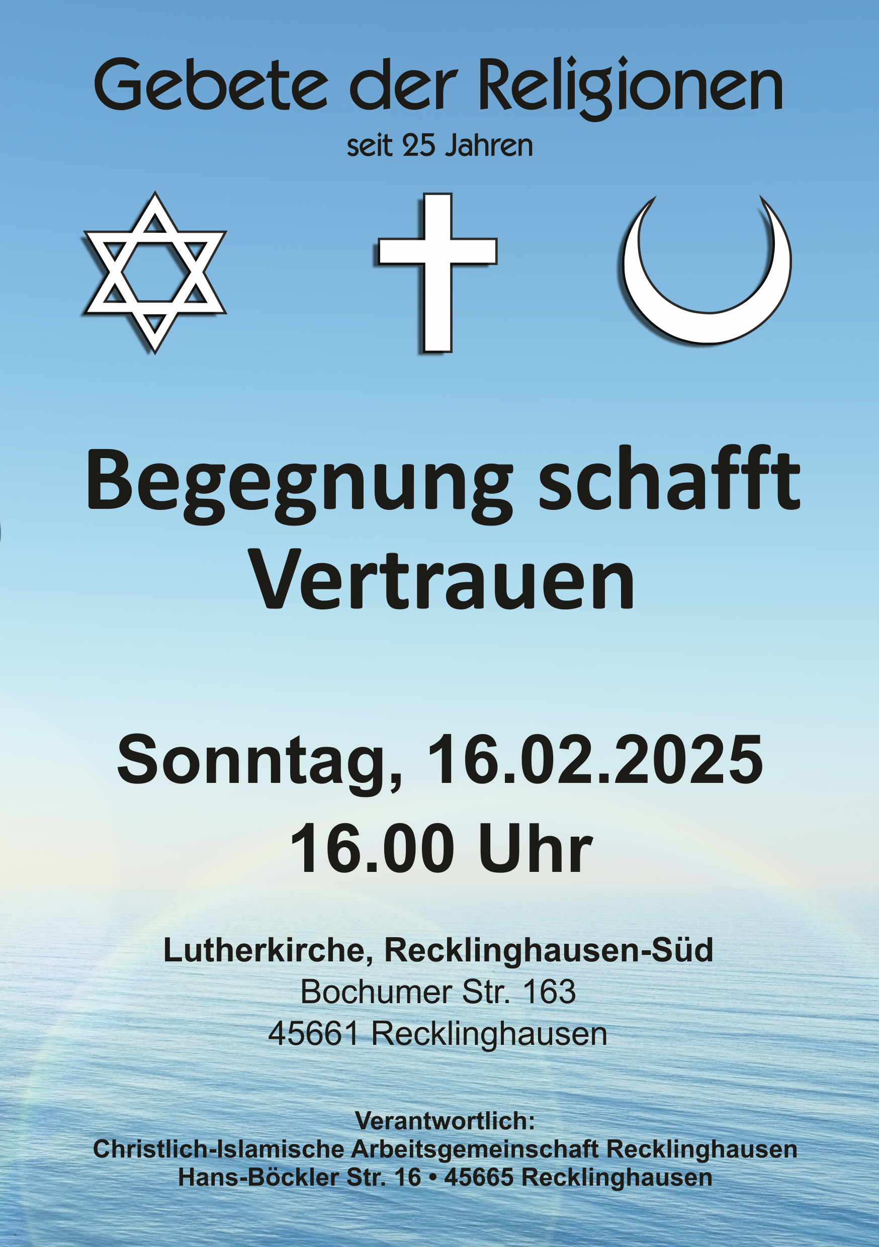 Am Nachmittag des 16.02.2025 trafen sich Vertreter und Mitglieder der drei monotheistischen Religionsgemeinschaften Judentum, Christentum und Islam in der Lutherkirche zu den schon traditionellen „Gebeten der Religionen“. Bereits seit 25 Jahren wird miteinander für Frieden und Verständigung gebetet in der Tradition der jeweiligen Religion. In diesem Jahr stand die Veranstaltung unter dem Motto „Begegnung schafft Vertrauen“. In diesem Sinn konnten die Teilnehmer im Anschluss bei Kaffee, Tee und Gebäck noch ins Gespräch kommen.
